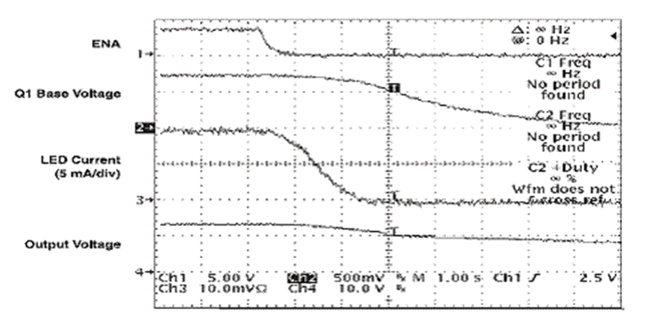 ENA 信號在電路斷開時下降,此時 D2 會阻止 C4 放電。TPS61040 保持開啟狀態,直到 C4 通過 R5 放電。在 TPS61040 仍為開啟狀態時,C3 開始通過 R3 和 R4 放電。隨著 Q1 可用基線電流 (base current) 的下降,Q1 的有效電阻開始升高。隨著 FB 引腳上總電阻的升高,LED">LED 電流會成比例下降。圖 4 顯示了電路斷開時的相關波形。