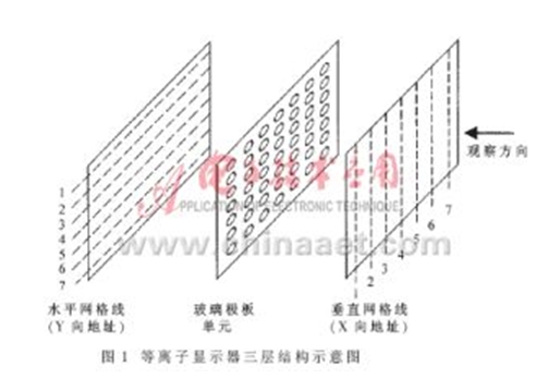 等離子顯示器是一種利用氣體放電的顯示裝置,這種屏幕采用了等離子管作為發光元件。大量的等離子管排列在一起構成屏幕。每個等離子對應的每個小室內都充有氖氙氣體。在等離子管電極間加上高壓后,封在兩層玻璃之間的等離子管小室中的氣體會產生紫外光,從而激勵平板顯示器上的紅綠藍三基色熒光粉發出可見光。每個離子管作為一個像素,由這些像素的明暗和顏色變化組合,產生各種灰度和色彩的圖像,與顯像管發光相似。等離子體技術同其它顯示方式相比存在明顯的差別,在結構和組成方面領先一步。其工作機理類似普通日光燈,等離子顯示器的三層結構如圖1所示。一般由三層玻璃板組成。在第一層的里面涂有導電材料的垂直條,中間層是燈泡陣列,第三層表面涂有導電材料的水平條。要點亮某個地址的燈泡,開始要在相應行上加較高的電壓,等該燈泡點亮后,可用低電壓維持氖氣燈泡的亮度。關掉某個燈泡,只要將相應的電壓降低。燈泡開關的周期時間是15ms,通過改變控制電壓,可以使等離子板顯示不同灰度的圖形。彩色等離子板目前還處于快速發展階段。