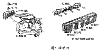 在車用燈具中,通常人們還將后轉向燈、制動燈、尾燈、后霧燈、倒車燈和行李箱燈等稱為輔助燈具,如圖3所示。