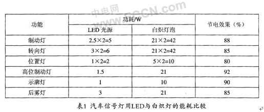 (2)非常節能,比同等亮度的白熾燈節能至少在一半以上。表1列示了汽車信號燈與白熾燈能耗的比較。