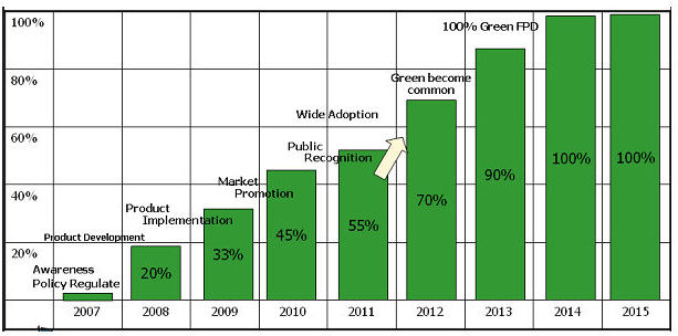 - 在2008年采用綠色環(huán)保技術(shù)或材料所生產(chǎn)的面板,預(yù)計在2012年將攀升至70%,并在2014年成為100%