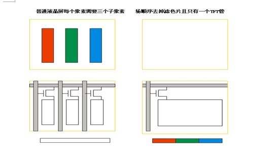 不僅如此,采用場(chǎng)順序以后,由于不需要再把每一個(gè)像素分為三個(gè)子像素,薄膜晶體管TFT也可以減少三倍,因此相當(dāng)于像素面積加大了三倍;或者說,如果保持像素面積不變,在相同的屏幕尺寸下,可以將分辨率提高三倍.