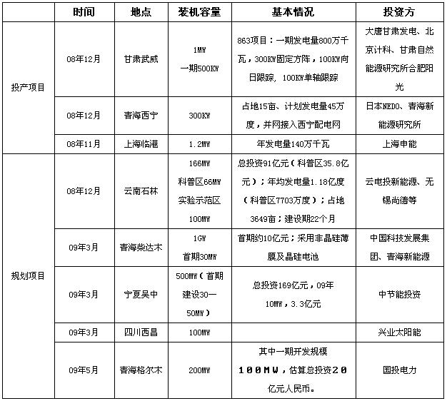 受國家政策的導向,從2008年底到2009年上半年,全國上馬了多個大型并網電站項目,如青海柴達木的1GW光伏電站項目、青海格爾木的 200MW光伏電站項目、寧夏吳中的500MW光伏電站項目等,盡管目前國家只批準了三個光伏電站項目包括上海崇明島1MW項目、255千瓦的內蒙古鄂爾多斯項目和甘肅敦煌的100MW項目,而以上新上馬的項目還有待國家的批復。