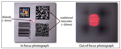 美國麻省理工學院(MIT)Media Lab研究人員發明出一種光學標簽,它儲存的數據比同尺寸條形碼多數百萬,卻沒有RFID標簽的安全疑慮。這種名為Bokode大小只有3mm,比傳統條形碼小很多,它藉由測量Bokode標簽發出的光線亮度和角度來形成數據。MIT實驗室的博士后研究員Ankit Moha為論文的主要作者。共同作者包括副教授Ramesh Raskar、 研究生Grace Woo、博士后研究員Quinn Smithwick及大阪大學的Shinsaku Hiura。