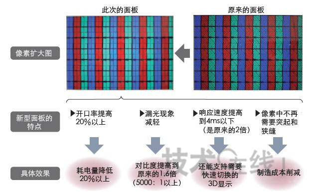 與原來相比,此次的液晶面板具有四大特點。即:耗電量低、對比度高、響應速度快、制造成本低。