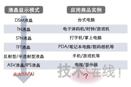 液晶顯示模式因液晶材料和驅動方法等的不同,可分為幾種方式。即ASV、“STN”和“IPS”等。