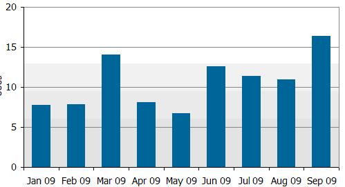 圖一 : 2009年1~9月北美大尺寸商用液晶顯示器(指26寸及以上尺寸)終端銷售量變化
