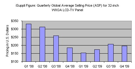 32英寸WXGA LCD電視面板可以代表市場趨勢,預(yù)計(jì)它在第四季度的平均價(jià)格是196美元,比第三季度時(shí)的208美元下降5.8%。