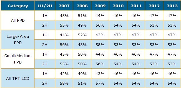 DisplaySearch觀察持續增長的中國市場,特別是對于電視機、筆記本電腦及顯示器等產品,已經改變了全球平板顯示市場季節循環特性。以往由于下半年是北美及歐洲市場的銷售旺季,因此往往下半年的市場總量占了全年55%甚至更高市場份額。然而根據DisplaySearch最新調研數據指出,2010年下半年全球大尺寸面板出貨量將由2009年58%市場份額,下滑至53%。