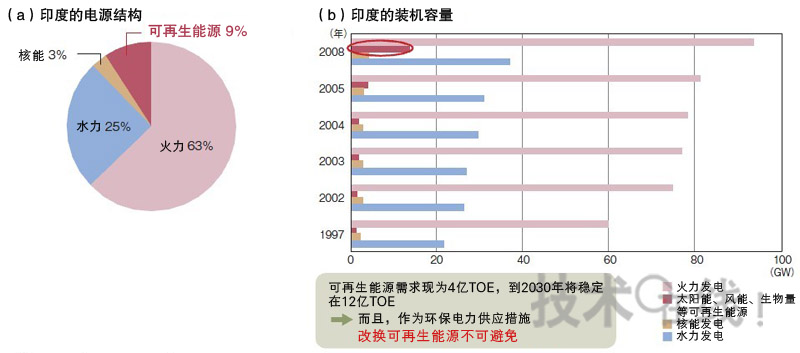為了解決上面不穩定的電力供應和環境問題,可再生能源成為了關注的焦點。民間調查機構的推測顯示,到2030年,印度對于可再生能源的需求將增加到現在4億TOE(石油換算噸)的3倍,達到12億TOE。