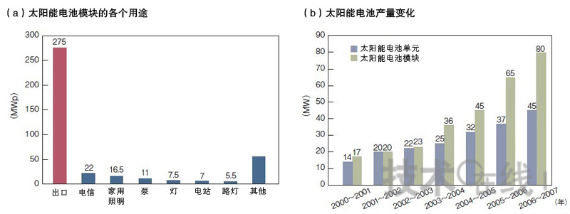 圖3:太陽能電池絕大多數出口在印度生產的太陽能電池模塊的用途中,出口占絕大多數。模塊和單元產量在2003年以后快速增加(b)。