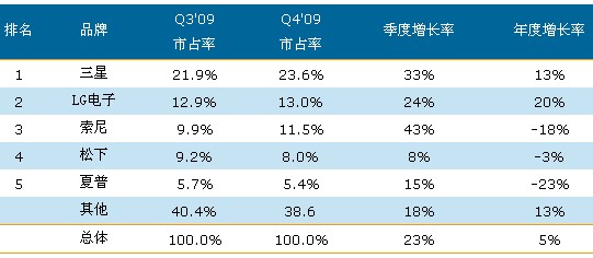 以銷售金額統計,三星在2009年第四季的全球電視市場占有率達到23.6%,并創下新高。三星的高銷售金額占有率主要來自于其在全球電視市場出貨量的領導地位、完整且堅強的產品尺寸布局、以及在先進技術與規格如LED背光源、超倍頻驅動等的領導地位,這些也造成了三星的電視平均實際銷售單價高于其它品牌。三星已經連續超過13個季度取得全球電視出貨量與銷售金額的雙料冠軍。2009年全年三星的市場銷售金額占有率達到了22.6%。