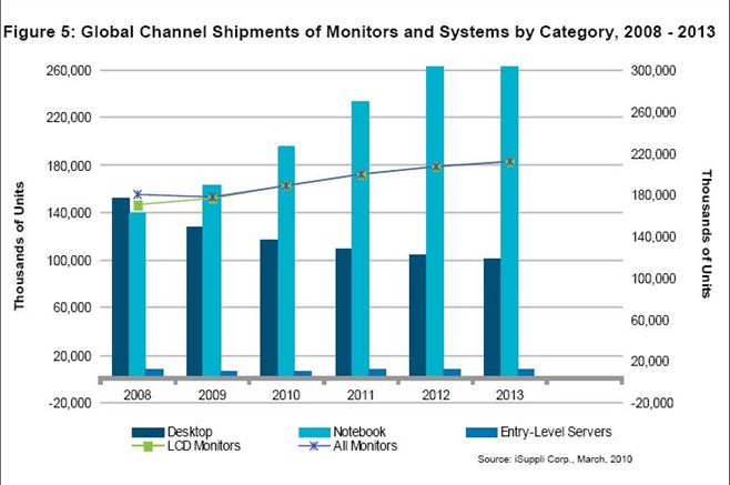 在景氣低迷時期的大部分時間里,顯示器的消費需求實際上強于企業需求,因為企業在此期間為了削減成本而裁員和大砍設備支出。2010年及以后,形勢將會發生轉變,企業客戶將扮演更重要的角色。