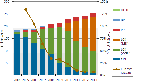 價格大幅下滑是促使2009年液晶電視高度成長的主要因素,2009年液晶電視平均售價下滑24%,遠遠超過以往的記錄。不過按總量加權后,2010年液晶電視平均價格預計將僅下滑5%,而等離子電視則下滑10%;對于2010年平均價格較和緩下滑主要考慮,其一消費者購買大尺寸電視比率有機會增長,另一方面,使用采用LED背光液晶電視有較高價格。在等離子電視的部分,經歷2009年成長率下滑2%,藉由40寸以上產品增長以及從更多廠商推出3D等離子電視,預計2010年等離子電視出貨量有機會成長6%,超過1千500萬臺。 另一方面傳統映像管電視市場持續萎縮,2009年下滑40%,預計2010年也將下滑36%。