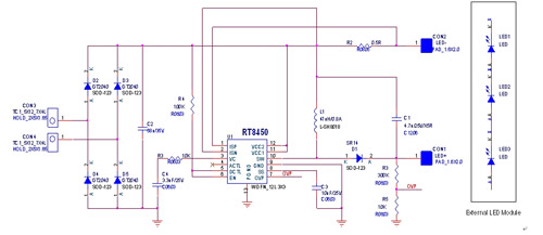 此外,RT8450升降壓架構在LED驅動電路不受輸入電壓變動影響的特性,可支持前級電路實現三端雙向可控硅(TRIAC)調光方案,因為這款芯片可利用將TRIAC的截波轉為PWM訊號后控制RT8450線性亮度調節的接腳,可以調控整體照明方案亮度明暗變化,而且不會出現閃爍情況。