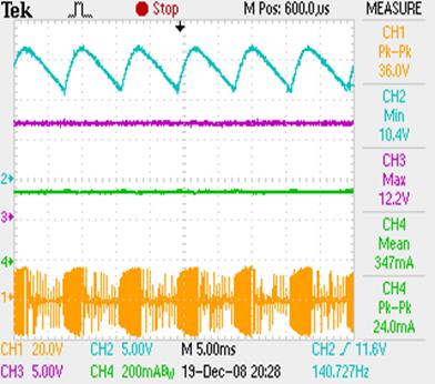 圖3:信道一為電子變壓器交流輸出電壓,信道二為經過整流及濾波后的輸入電壓,信道三為交流輸入電壓,信道四為LED輸出電流。