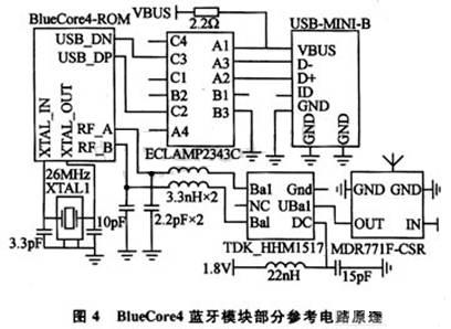 PC主機使用USB接口和BlueCore4藍牙模塊連接,對應的藍牙模塊同樣通過USB接口和S3C2440A的USB-HOST接口進行連接。USB接口具有即插即用的優點。通過Linux操作系統的支持,該模塊還可以使用通用的USB藍牙適配器替代。BlueCore4藍牙模塊部分參考電路原理如圖4所示。