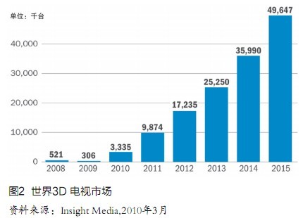 Insight Media市場(chǎng)研究公司3月發(fā)表的最新報(bào)告更加樂(lè)觀,預(yù)測(cè)世界3D電視市場(chǎng)將從今年的340萬(wàn)臺(tái)飚升到2015年的4965萬(wàn)臺(tái),增長(zhǎng)10倍還多(圖2),屆時(shí)占有率將超過(guò)20%。其對(duì)手公司iSupp1i公司尤其樂(lè)觀,認(rèn)為同期世界3D電視市場(chǎng)將從420萬(wàn)臺(tái)竄升到7800萬(wàn)臺(tái),占有率達(dá)40%,銷(xiāo)售額644億美元。