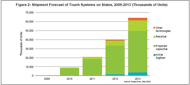 圖2所示為iSuppli公司對(duì)于2009-2013年平板電腦市場(chǎng)觸摸系統(tǒng)的預(yù)測(cè)。