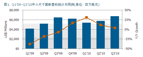 全球中小尺寸面板的出貨在2010年第二季持續攀升,營收數字達到五十四億美元,比去年同期成長百分之三十一。根據最新的Quarterly Small/Medium Shipment and Forecast Report指出, 這個市場區隔預計持續成長,而在2010年第三季的全球營收數字將會達到六十七億美元。