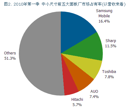 Samsung Mobile Displays 不論在出貨量和營收上都維持穩定地位,分別在全球市場擁有11.8%和16.84的市場占有率,同時在手機所需的TFTLCD和AOMLED面板上都有很高的出貨量。Sharp的營收在2010年第二季呈現大幅下滑,這是因為相較于競爭對手而言,市場上對于可攜式游戲機等裝置的需求下跌所致。 Toshiba的營收沒有像競爭對手下滑這么多,這是因為高分辨率手機和汽車用顯示器的需求增加所致。