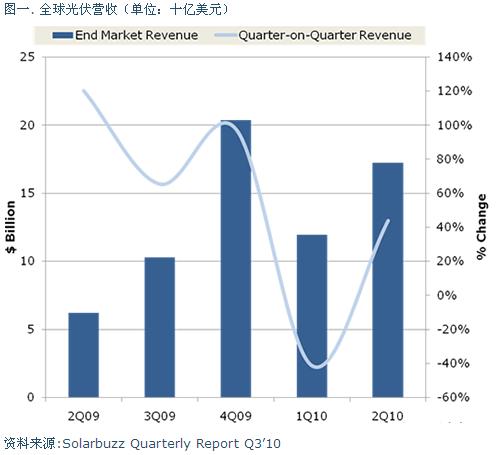 整個太陽能光伏產業的營收在2010年第二季度達到172億美元,相較于第一季度120億與2009年第二季度62億都有較大的增長幅度。