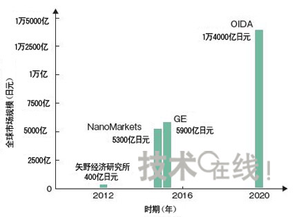 [page]圖有機EL照明/光源市場到2020年將占到照明市場整體的2成圖為針對包括普通照明、特殊照明及背照燈等在內的有機EL照明今后的市場規模,日本矢野經濟研究所、NanoMarkets、GE及OIDA發布的預測及目標。市場規模方面,預計2015年全球將達到5000多億日元,到2020年將大大超過1萬億日元。