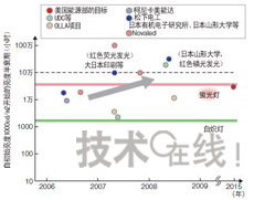 政府機構的資助額大多為3年內數億~30億日元的規模,德國“OPAL(OrganicPhosphorescentlightsforApplicationsintheLightingmarket)”項目為5年內1億歐元(約合140億日元),遠遠多于其他項目。在發光效率方面迅速追趕白色LED有機EL照明雖然具有一些獨特的特點,但考慮到實際影后,還是避免不了在發光效率、使用壽命、成本等基本性能上與白色LED及現有照明技術一決高低。近來有機EL照明的性能得到了大幅提高。首先是發光效率。目前,有機EL照明在研發水平上比白色LED約落后約2年。2008年6月美國UniversalDisplay(UDC)發布的“102lm/W”的發光效率,與2006年3月日本日亞化學工業發布的白色LED的發光效率不相上下。山形大學的城戶表示,“已經看到了實現200lm/W的曙光”)。