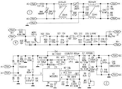 MC33262是一款可靠且成本低廉的功率因數校正芯片,其應用電路如圖2所示。市電經電源濾波器和整流器得到脈動直流電。電流通過啟動電阻R10向C2充電至10V時,IC1開始工作。整流后的直流脈動電壓在R5的分壓作為取樣信號經IC1的③腳輸入乘法器。