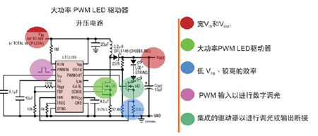 在高電流情況下驅動LED要求有一個DC/DC控制器,以精確地調整電流,確保一致的光密度和顏色的統一性,并保護LED。此外,一個巨大的挑戰是利用電池電壓為一或幾串LED供電,電池電壓可以小于、等于或大于其負載電壓。另一個考慮是要有效地對大調光比率的LED進行調光,同時維持其在低和高亮度水平上的色彩特性。此外,DC/DC驅動器的有效運行是一個關鍵因素,特別是在驅動高亮度LED時,因為所有沒有用來照明的功率將成為熱損耗。