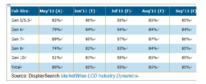 DisplaySearch最新發(fā)布的研究報(bào)告指出,由于2011年第三季度市場需求不太明朗,大尺寸TFT LCD面板價(jià)格在6月中旬停止上漲。隨著市場需求特別是電視市場需求的減少,面板供應(yīng)商積極調(diào)整以防止面板價(jià)格出現(xiàn)大幅波動(dòng)。面板商原本計(jì)劃于第三季度啟動(dòng)全部產(chǎn)能,使平均利用率達(dá)到90%。但根據(jù)DisplaySearch 6月份更新的MarketWise-LCD Industry Dynamics報(bào)告顯示,從6月份到9月份TFT LCD面板實(shí)際產(chǎn)能利用率將一直維持在85%。