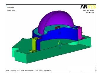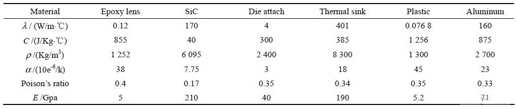 以Lumileds 的1 W 功率型LED 器件(如圖1)為研究對象,該LED 由透鏡、芯片、鍵合層、熱沉、基板及塑封料組成。熱量由芯片經鍵合層傳導到熱沉,最后由基板與空氣進行對流散熱。LED 各種封裝材料熱性能參數如表1 所示。