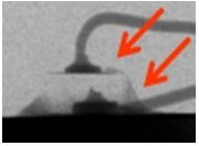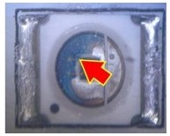 2. 變色:這類(lèi)失效是指LED不點(diǎn)亮的狀況下,外觀顏色或膠材透明度與新品不同,用肉眼即可看出,通常在產(chǎn)品使用一段時(shí)間或在做完可靠度試驗(yàn)后發(fā)生。一般說(shuō)來(lái),變色區(qū)域大致可區(qū)分為發(fā)生在導(dǎo)線架或封裝膠材兩類(lèi),若發(fā)生在導(dǎo)線架,通常是因?yàn)楸砻媾c環(huán)境中的化學(xué)物質(zhì)發(fā)生反應(yīng),如氧化或硫化,要分辨屬于哪種需仰賴成份分析,可使用的儀器包含有EDS(Energy Dispersive X-ray Spectroscope)、XPS(X-ray Photoelectron Spectrometer)、AES(Augur Electron Spectroscope)等等。若是封裝用的膠材發(fā)生變色,則屬于高分子材料的劣化現(xiàn)象,如環(huán)氧樹(shù)脂易受高溫或是紫外光影響而變黃,因此白光LED多改采矽膠取代之。分析此類(lèi)失效應(yīng)特別留意,因膠材本身有一定的透明度,有時(shí)變色的導(dǎo)線架因被膠材蓋住而誤判為膠材變色,引導(dǎo)至錯(cuò)誤的改善方向。
