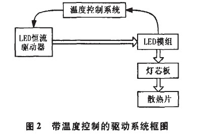 此方案通過控制驅(qū)動器的輸出電流來實現(xiàn)對LED燈的溫度控制。圖2為恒流驅(qū)動器驅(qū)動LED燈框圖,驅(qū)動器輸出到LED模組,LED模組上產(chǎn)生的熱量通過良好的導(dǎo)熱材料傳導(dǎo)到燈芯板,最后經(jīng)由散熱片散熱到大氣中。當(dāng)外界散熱環(huán)境惡劣時,LED模組的溫度會達到溫度控制系統(tǒng)設(shè)定的溫度,得到反饋的信息后,驅(qū)動器減少輸出,達到限制并降低LED模組溫度的目的。