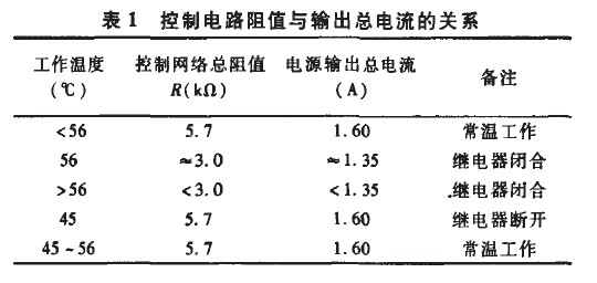 處于斷開狀態(tài),此時控制電路中只有W1起控制作用,設(shè)定常溫工作總電流恒定為1.60A。當(dāng)繼電器溫度上升到56℃時,Kt自動閉合,整個控制電路開始工作,以減小恒流電源的輸出;當(dāng)溫度降低到45℃時,Kt自動斷開,電源額定輸出。該過程可用圖4表示,圖中T為Kt的溫度,Rntc為NTC的阻值。