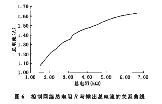 控制電路阻值與輸出總電流的關(guān)系列于表1,其中R為控制電路的等效電阻。經(jīng)過在恒溫箱中測試,每2℃記錄1組數(shù)據(jù)得到如圖5所示的NTC熱敏電阻的溫度一阻值曲線。該方案中,驅(qū)動電源通過接收到反饋的溫度信息來控制輸出電流,根據(jù)圖5中NTC的溫度與阻值的關(guān)系,只要找到輸出電流隨總阻值的變化關(guān)系(如圖6所示),再進行適當(dāng)?shù)碾娮杵ヅ洌憧烧业綔囟扰c驅(qū)動器輸出電流的關(guān)系。