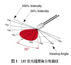 LED的發光強度隨觀察角度的變化而變化,從不同角度觀察LED發光管,它的發光強度有很大差別。發光強度的大小由LED發光管自身的發光強度角分布曲線決定,其分布曲線如圖1所示。LED光軸方向相對發光強度(即發光強度與最大發光強度的之比)為1,即發光強度最大。離開光軸方向的角度越大,相對發光強度越小。由圖1可以估算出該LED的半值角,視角值為。