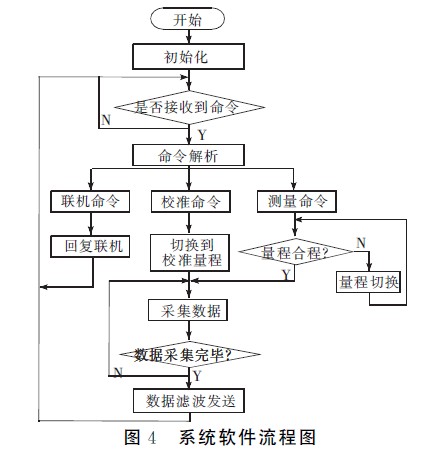 系統軟件采用C語言編寫,在IAR公司提供的集成調試環境Workbech下采用模塊化思想進行設計。系統的軟件程序固化在MSP430F149單片機的內部Flash存儲器中。系統的程序流程如圖4所示。整個流程可分為初始化、命令解析、數據測量、數據處理及顯示程序。程序設計借鑒實時操作系統的思想,劃分事件和目標。系統按照工作過程共有命令解析、聯機、校準、測量判斷、數據采集、數據打包發送等幾個事件,通過對事件的處理來完成相應的功能,并進行必要的狀態轉換。當電壓改變后,接收到測量命令,進入測量狀態,將數據發送并顯示,回到空閑狀態繼續等待命令然后進行相應的操作。