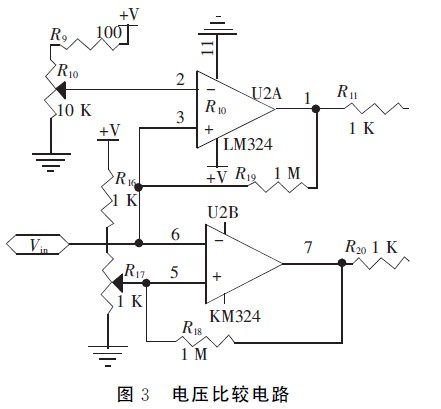 放大后的電壓Vin分別輸入單片機A/D通道和由LM324組成的上下限電壓比較器,根據比較器輸出分析信號幅度是否在規定范圍內。為了使電路工作更穩定,比較電壓值需預留一定的豁量。如圖3所示,調節R10使比較上限電壓為2.3V,調節R17使比較下限電壓為0.1V,當Vin在0.1~2.3V時,量程合適,比較器輸出邏輯電平00,啟動A/D轉換電路。否則,當Vin>2.3V時,通過模擬開關MAX312并配合軟件來切換I/V轉換電路的反饋電阻,向大量程切換;當Vin<0.1V時,向小量程切換,以適應不同強度的光信號。