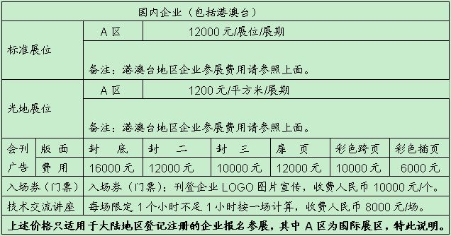 1、標(biāo)準(zhǔn)展位(3m×3m﹦9M2,配置:公司中英文楣牌、展出場地、展位地毯、三面2.5M高圍板、一張洽談桌、二把椅子、一個(gè)220V電源插座、兩支射燈。)