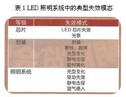 LED模組和燈具的典型失效模式包含了不同層次的失效模式,涉及到LED封裝結(jié)構(gòu)以及工藝過(guò)程(如表1)。LED在實(shí)際使用中,由于復(fù)雜的環(huán)境以及封裝工藝局限性從而使封裝材料退化、熒光粉退化、金屬電遷移、局部溫度過(guò)高產(chǎn)生的熱應(yīng)力所引起的芯片和硅膠的分層或金線斷裂等等,從而影響LED發(fā)光甚至導(dǎo)致整個(gè)LED的失效。而且LED產(chǎn)生的高溫會(huì)導(dǎo)致芯片的發(fā)光效率降低,光衰加快、色移等嚴(yán)重后果。