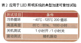 由于LED壽命長(zhǎng),通常采取加速環(huán)境試驗(yàn)的方法進(jìn)行可靠性測(cè)試與評(píng)估。加速度測(cè)試將會(huì)模仿燈具的應(yīng)用條件或用戶要求,這樣可以更有效地研究各種破壞機(jī)理,提供大量數(shù)據(jù)去研究LED的結(jié)構(gòu)、材料、工藝從而更好完善LED產(chǎn)品。一些典型的加速可靠性試驗(yàn)(如表2)。