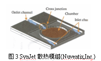 除了熱界面外,主動(dòng)散熱系統(tǒng)已越來(lái)越受企業(yè)的歡迎。圖3給出了SynJet主動(dòng)散熱模塊,它可以產(chǎn)生脈動(dòng)空氣,從而可以把LED燈內(nèi)部的熱直接帶到外面。據(jù)了解,SynJet技術(shù)可以幫助設(shè)計(jì)師解決一些產(chǎn)品的散熱問(wèn)題,如電腦產(chǎn)品,特別是高可靠性的LED產(chǎn)品。該技術(shù)有高散熱效率、低噪音、高可靠性和低功耗等優(yōu)點(diǎn)。