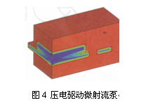 另一種主動(dòng)冷卻系統(tǒng)是利用壓電驅(qū)動(dòng)而產(chǎn)生脈動(dòng)空氣,如圖4所示。該結(jié)構(gòu)簡(jiǎn)單,由一個(gè)PZT膜片和流動(dòng)通道構(gòu)成。該流動(dòng)通道中設(shè)計(jì)者重點(diǎn)論述了出口和進(jìn)口通道的設(shè)計(jì)。這種結(jié)構(gòu)允許每一個(gè)振動(dòng)周期中的流體在管道中的阻力和動(dòng)力差別。