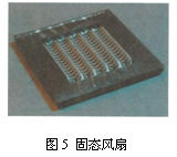 圖5顯示了一種固態(tài)風(fēng)扇,這是Dan Schlitz和Vishal Singhal經(jīng)過(guò)六年的不斷積累所發(fā)明的成果。他們?cè)?jīng)是美國(guó)普渡大學(xué)研究人員,現(xiàn)在就職于Thorrn微技術(shù)公司。該研究表明它具有超薄風(fēng)扇的功能但沒(méi)有任何運(yùn)動(dòng)部件。其原理是在空氣中微電極靠的很近的時(shí)候,空氣被電離,由于這些離子的運(yùn)動(dòng)而產(chǎn)生動(dòng)能,從而推動(dòng)空氣產(chǎn)生吹風(fēng)效果。他們還提到,希望將來(lái)該技術(shù)在成本上可以接近傳統(tǒng)的冷卻系統(tǒng)。