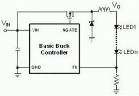 通常儲能電感是和LED串聯(lián),開關(guān)導通時,電感儲能;開關(guān)斷開時電感通過二極管繼續(xù)有電流流通。由于輸出電壓是輸入電壓減去電感電壓,所以是降壓型。LED中的電流經(jīng)過檢測電阻測量以后反饋回控制器。來控制PWM的工作比,以實現(xiàn)恒流的控制。