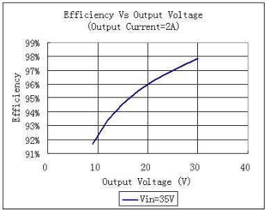 降壓型恒流源的缺點是要求輸入電壓高于輸出電壓,而太陽能LED路燈中所采用的蓄電池往往是12V,頂多是24V。而路燈中的LED通常是10個串聯(lián),其所要求的總輸出電壓往往在33V-36V左右,因此較難采用降壓型的恒流源。而降壓型恒流源的優(yōu)點是效率高。因為輸入電壓高于輸出電壓,所以輸入電流小于輸出電流。電流小有助于減小電阻性損耗。圖15表明一個降壓型恒流源在輸入電壓固定在35V,輸出電流固定在2A時,其效率和輸出電壓的關(guān)系曲線。