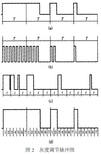 (2) 控制單位時(shí)間內(nèi)L ED 的導(dǎo)通時(shí)間。L ED具有快速時(shí)間響應(yīng)特性,最高可達(dá)數(shù)十兆赫茲,可以用脈沖方式驅(qū)動(dòng)L ED 發(fā)光,例如用1 MHz ,占空比為0. 25 % ,峰值電流為1 A 的脈沖去驅(qū)動(dòng)L ED ,與用25 mA 的直流驅(qū)動(dòng),其發(fā)光亮度是一致的。顯然,調(diào)節(jié)驅(qū)動(dòng)脈沖的占空比,可獲得不同的灰度級(jí),那么如果用CRT 圖像信號(hào)各像素點(diǎn)的離散圖像數(shù)據(jù)去控制對(duì)應(yīng)L ED 的導(dǎo)通時(shí)間,即可獲得多灰度級(jí)顯示圖像1圖2 表示周期時(shí)間T 內(nèi),占空比分別為1 、4P7 、2P7 、1P7 的脈沖去驅(qū)動(dòng)L ED ,顯然獲得亮度比為7∶4∶2∶1 ,這樣最高灰度級(jí)為7 ,共可獲得8 個(gè)灰度級(jí)。