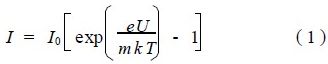 式中m 為復(fù)合因子, I0為反向飽和電流, UT =kT/e 稱為溫度電壓當(dāng)量,在熱力學(xué)溫度T = 300 K時(shí),UT = 26 mV1 在寬禁帶半導(dǎo)體中, 當(dāng)I <0. 1 mA時(shí),通過結(jié)內(nèi)深能級(jí)進(jìn)行復(fù)合的空間復(fù)合電流起支配作用,這時(shí)m = 2 ;電流增大后擴(kuò)散電流占優(yōu)勢(shì)時(shí)m = 1.U 為外加電壓。