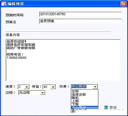 ★ 文本顯示方式有左移,下移,畫卷展開等多種效果,速度30級可調(diào)、停頓時間50級可調(diào)。